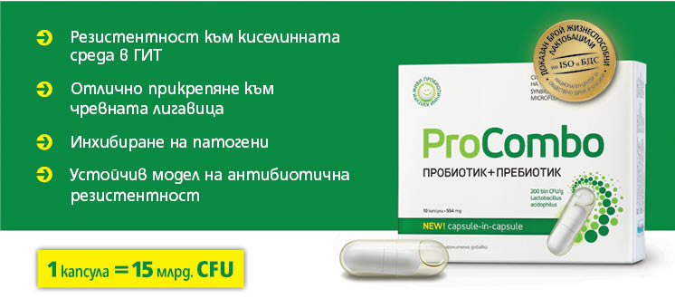 Всред нашата фармацевтична мрежа, известност и значимост придобива употребата на синбиотичния препарат ПроКомбо (ProCombo). Лечебната сила и полза от препарата се състои в осигуряване на качествена бионаличност на адекватно и надеждно контролирано количество живи пробиотични култури Lactobacillus acidophilus La14® (200 млрд. CFU/g), което ефективно се съчетава с пребиотични късоверижни фруктоолигозахариди, имащи избирателно подхранващо въздействие само върху пробиотиците Lactobacillus. Пребиотичната субстанция в ПроКомбо е нискокалорична, несмилаема и преминава през стомаха и червата без да се разгражда или абсорбира, подпомагайки поддържането на жизнената активност на Lactobacillus, особено в киселинната среда на стомаха и в тънките черва, където има високи концентрации на жлъчни соли.