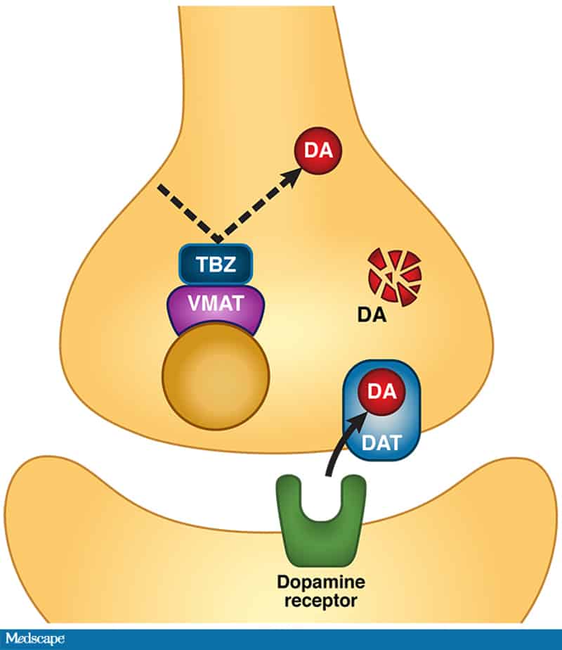 Тетрабеназин сам по себе си е агент, изчерпващ допамина, който инхибира ВМАТ2, който е включен в поемането на моноамина от пресинаптичните мехурчета. Следователно, ВМАТ2 инхибиторите изчерпват нервотрансмитерния запас в централната нервна система.